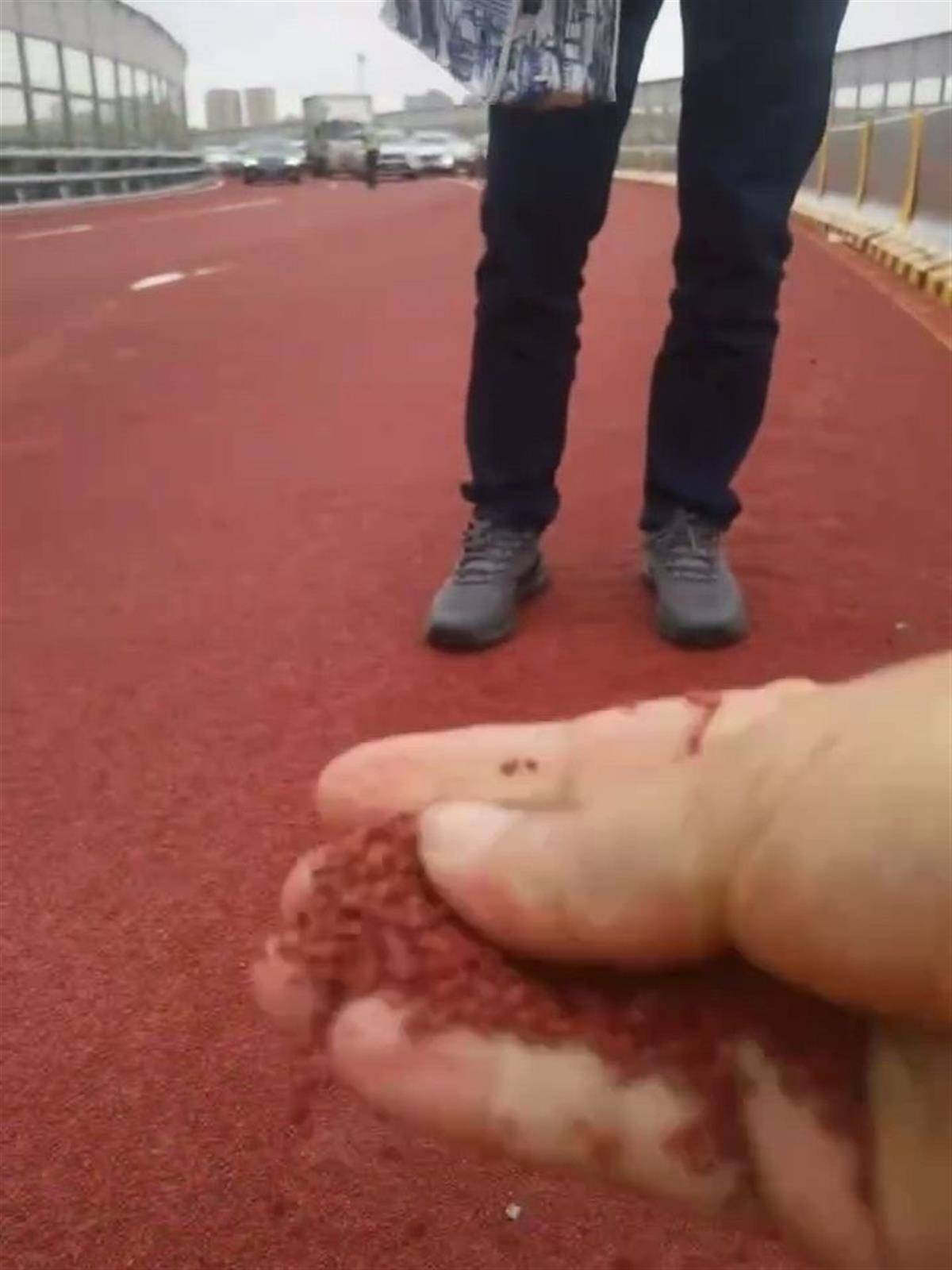 网友发布的视频显示,在路面的外道处,一辆银色小车在行驶过程中发生漂移,最终撞向了道路中间的隔离栏,车辆的车头受损。疑似车主本人在社交平台发布视频称,她的车在东联路上出事故,与路面的工程质量有关,其用手抓起一把路面的红色细碎颗粒。