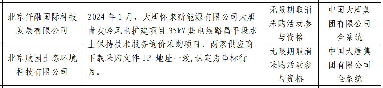 公告显示,北京仟融国际科技发展有限公司与北京欣园生态环境科技有限公司 ,在2024 年 1 月,大唐怀来新能源有限公司大唐青灰岭风电扩建项目 35kV 集电线路昌平段水土保持技术服务询价采购项目,两家供应商下载采购文件 IP 地址一致,认定为串标行为。