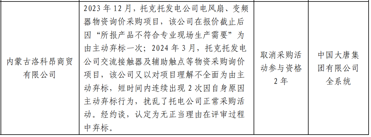 公告显示,内蒙古洛科昂商贸有限公司,在2023 年 12 月,托克托发电公司电风扇、变频器物资询价采购项目,该公司在报价截止后 因“所报产品不符合专业现场生产需要”为由主动弃标一次;2024 年 3 月,托克托发电公司交流接触器及辅助触点等物资采购询价项目,该公司又以对项目理解不全面为由主动弃标,短时间内连续出现 2 次因自身原因主动弃标行为,扰乱了托电公司正常采购活 动。经约谈,认定为无正当理由在评审过程中弃标。