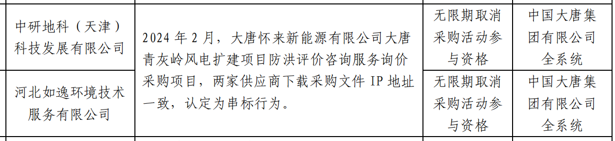 公告显示,中研地科(天津)科技发展有限公司与河北如逸环境技术服务有限公司,在2024 年 2 月,大唐怀来新能源有限公司大唐青灰岭风电扩建项目防洪评价咨询服务询价采购项目,两家供应商下载采购文件 IP 地址 一致,认定为串标行为。