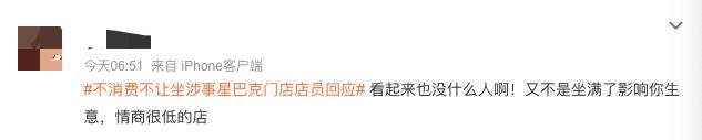 视频拍摄者表示,他看到这个小伙子刚坐下一分钟就被劝离,称店员一共劝走了3拨人,当时也没多少人,不理解为什么不让坐。