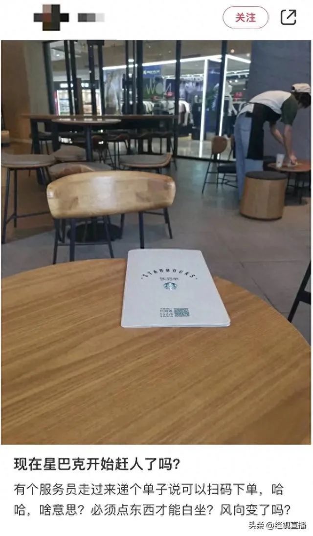 网传视频显示,男子询问:“不让坐是吧?”星巴克员工则回应:“你要坐就手机下单,你可以去商场那边坐。”最终,这名男子起身离开。