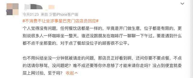 对此,不少网友表示支持,认为“以免想喝的人没位子”,也有网友支招,星巴克如果真要实施这项政策,可以在座位上立个牌子,写上“消费入座”几个字,否则被劝离很尴尬。