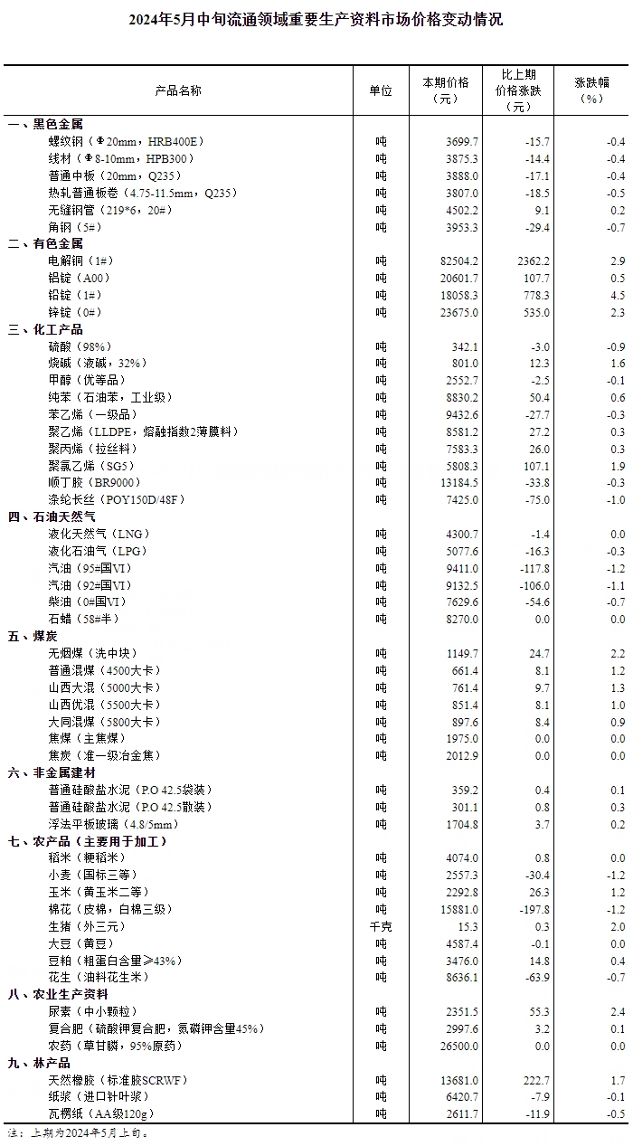 据对全国流通领域9大类50种重要生产资料市场价格的监测显示,2024年5月中旬与5月上旬相比,24种产品价格上涨,19种下降,7种持平。