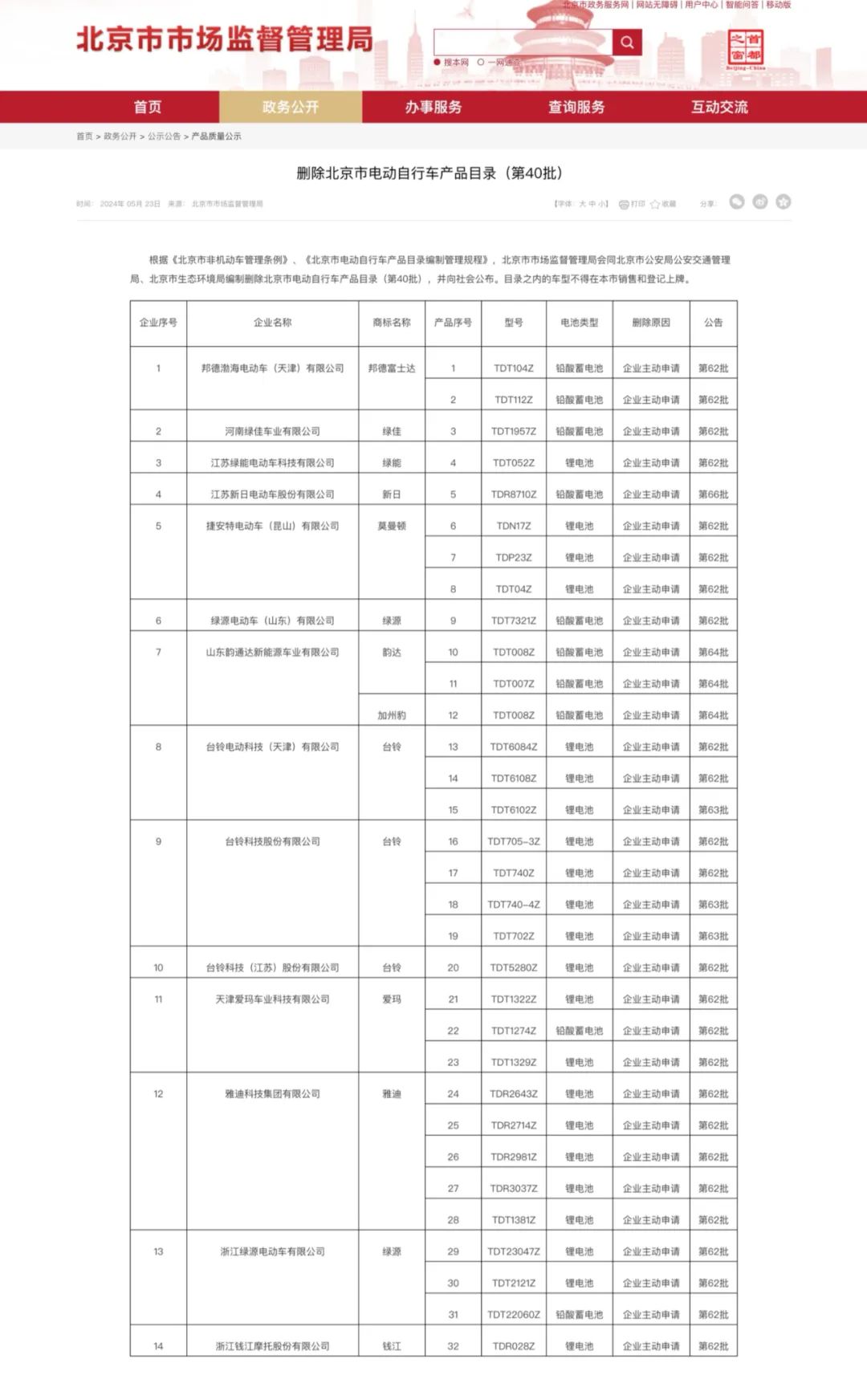 5月23日,北京市市场监管局公告第40批删除电动自行车产品目录。公告显示,根据《北京市非机动车管理条例》、《北京市电动自行车产品目录编制管理规程》,北京市市场监督管理局会同北京市公安局公安交通管理局、北京市生态环境局编制删除北京市电动自行车产品目录(第40批),并向社会公布。目录之内的车型不得在北京市销售和登记上牌。