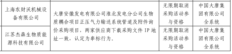 公告显示,上海农财沃机械设备有限公司与江苏杰森生物质能源科技有限公司,在大唐安徽发电有限公司淮北发电分公司生物质耦合项目正压气力输送系统管道及附件询价采购项目,两家供应商下载采购文件IP地址一致,认定为串标行为。