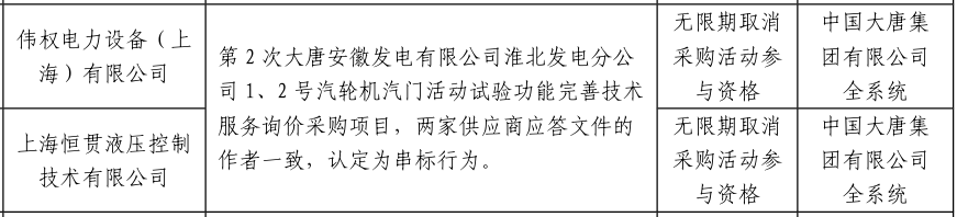 公告显示,伟权电力设备(上海)有限公司与上海恒贯液压控制技术有限公司 ,在第2次大唐安徽发电有限公司淮北发电分公司1、2号汽轮机汽门活动试验功能完善技术服务询价采购项目,两家供应商应答文件的作者一致,认定为串标行为。