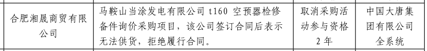 公告显示,合肥湘晟商贸有限公司,在马鞍山当涂发电有限公司t160 空预器检修备件询价采购项目,该公司签订合同后表示无法供货,拒绝履行合同。