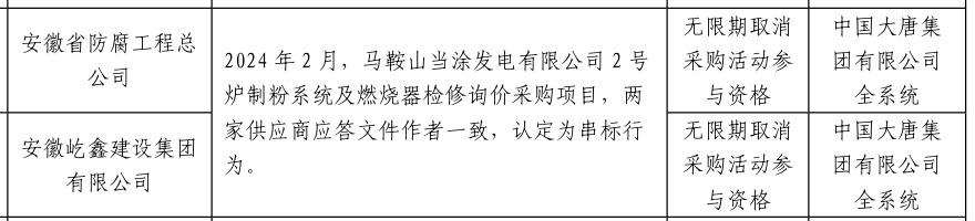 公告显示,安徽省防腐工程总公司与安徽屹鑫建设集团有限公司 ,在2024年2月,马鞍山当涂发电有限公司2号炉制粉系统及燃烧器检修询价采购项目,两家供应商应答文件作者一致,认定为串标行为。