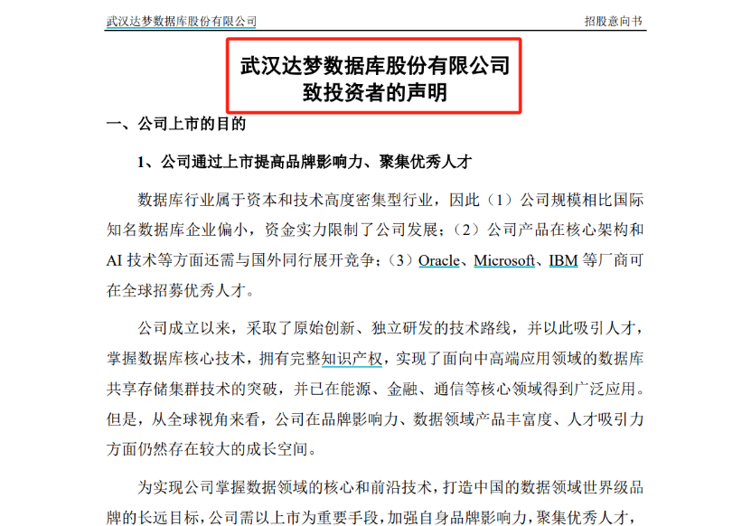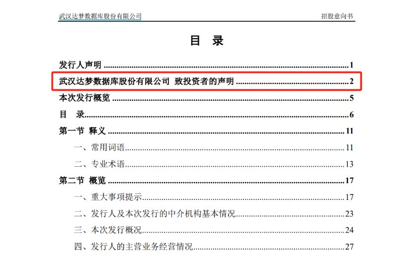 5月22日晚间,达梦数据发布了招股意向书,招股书在扉页显要位置刊登了致投资者的声明。这是应监管要求出现的首份新版招股书。