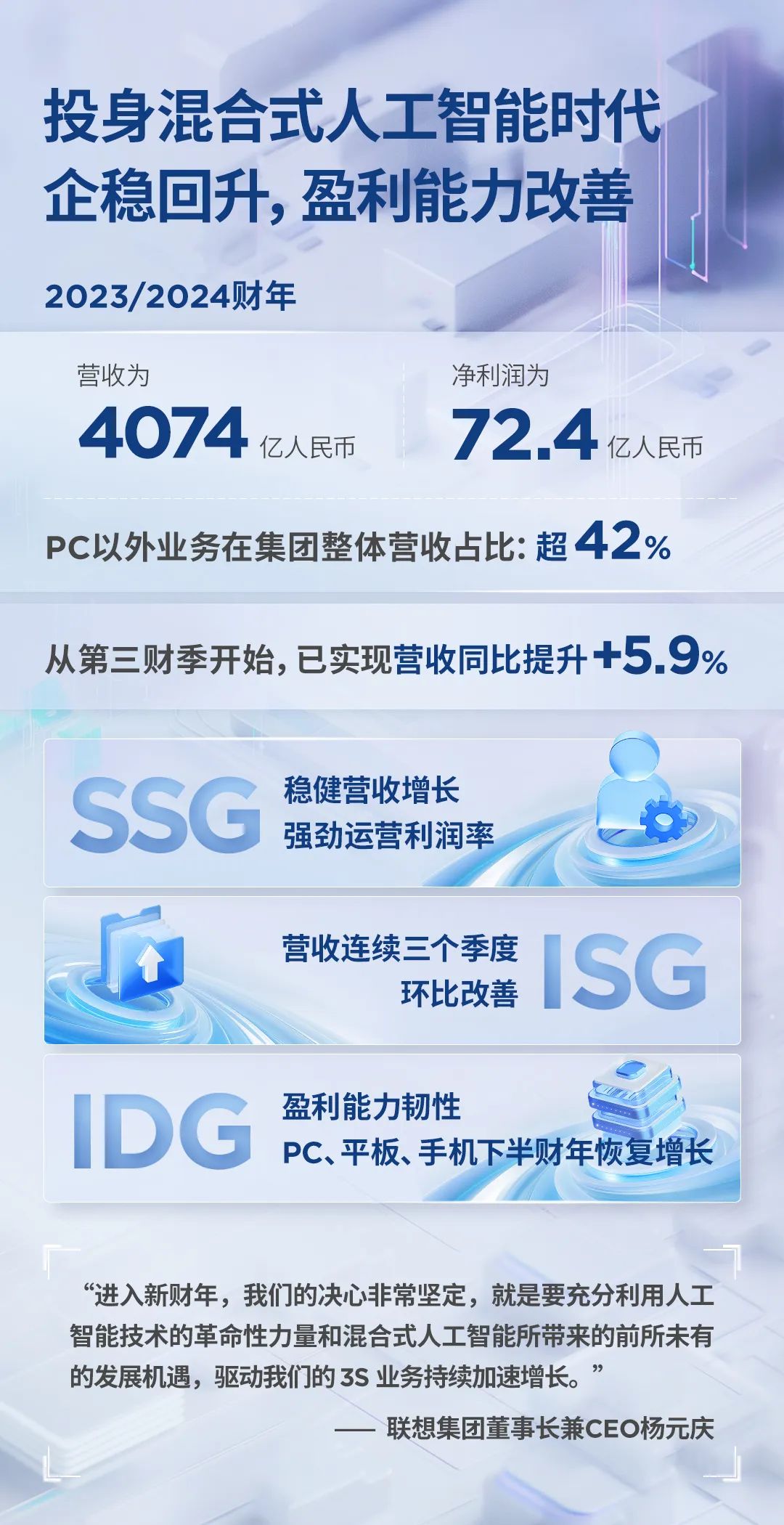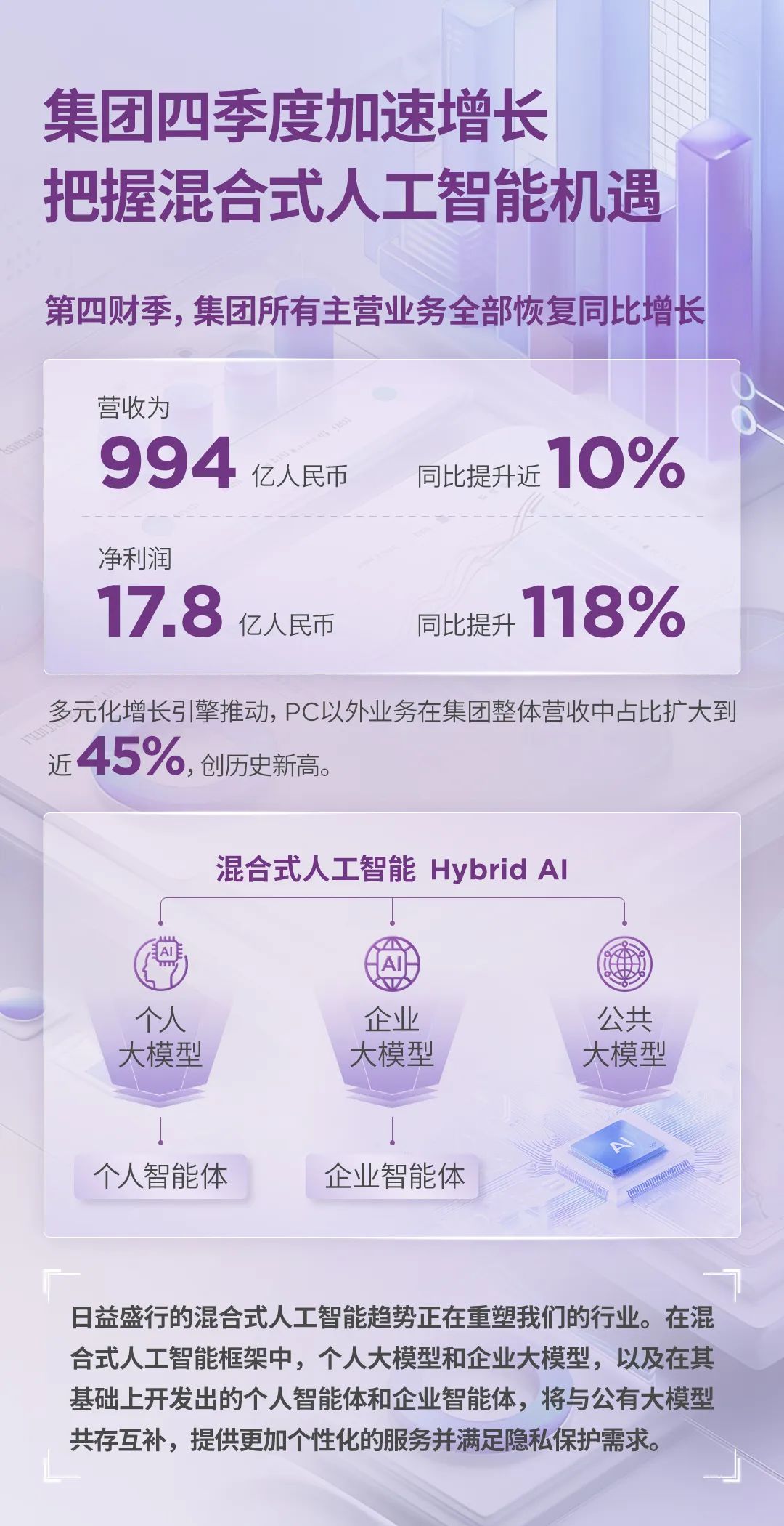 联想集团董事长兼CEO杨元庆表示,“进入新财年,我们的决心非常坚定,就是要充分利用混合式人工智能所带来的前所未有的发展机遇,驱动3S 业务加速增长。对于创新的持续投资,全栈产品组合,韧性运营,以及强大的生态系统合作伙伴关系,都将助力联想实现营收和盈利能力强劲的可持续增长。”