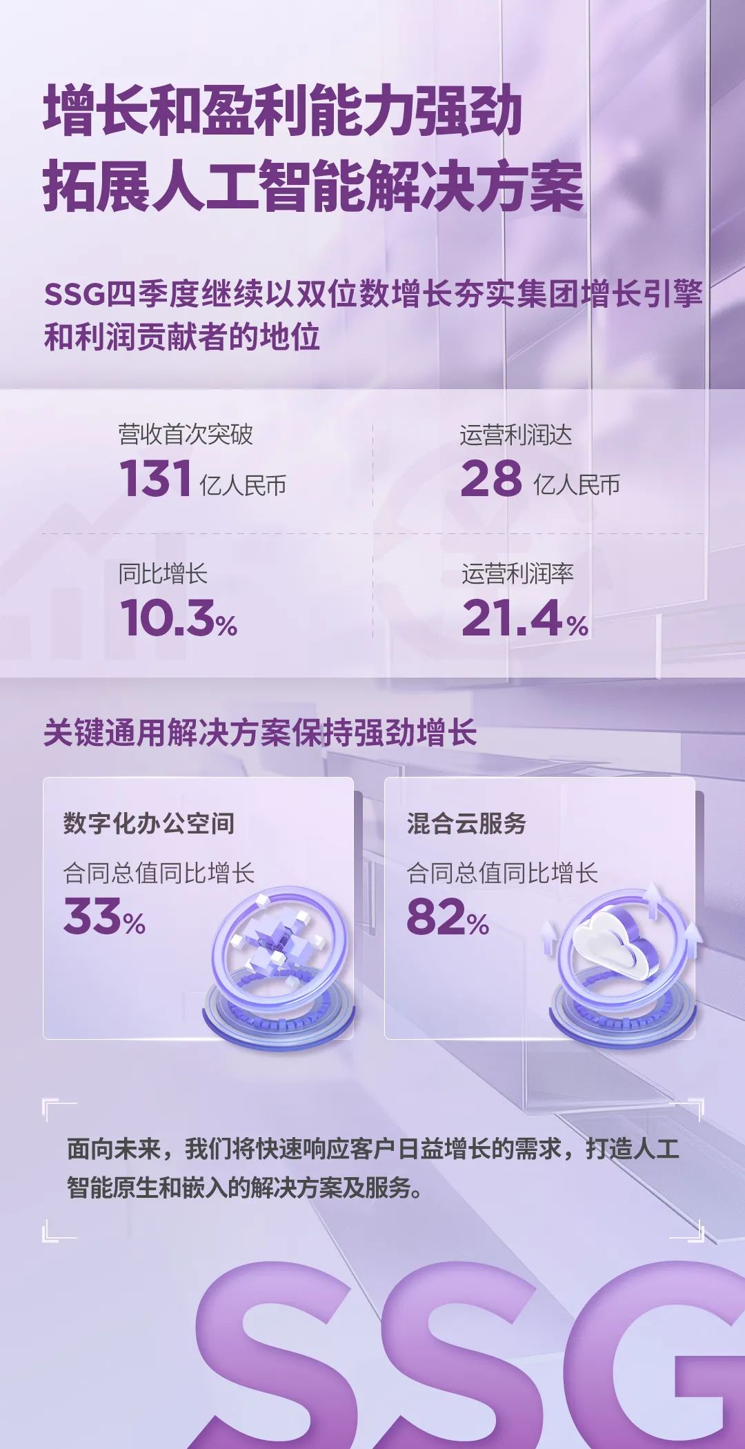 4.SSG方案服务业务集团第四财季营收131亿人民币,同比增长10.3%;