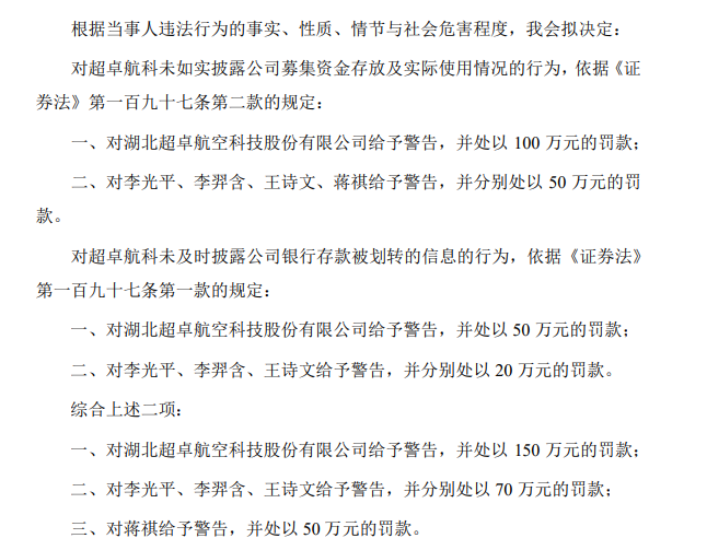 被证监会立案调查6个多月后,5月22日晚间,超卓航科发布公告称,公司于当日收到《行政处罚事先告知书》,因涉嫌未如实披露公司募集资金存放及实际使用情况、未及时披露公司银行存款被划转的信息,该公司和多名相关责任人均将被罚,拟罚款金额超400万元。