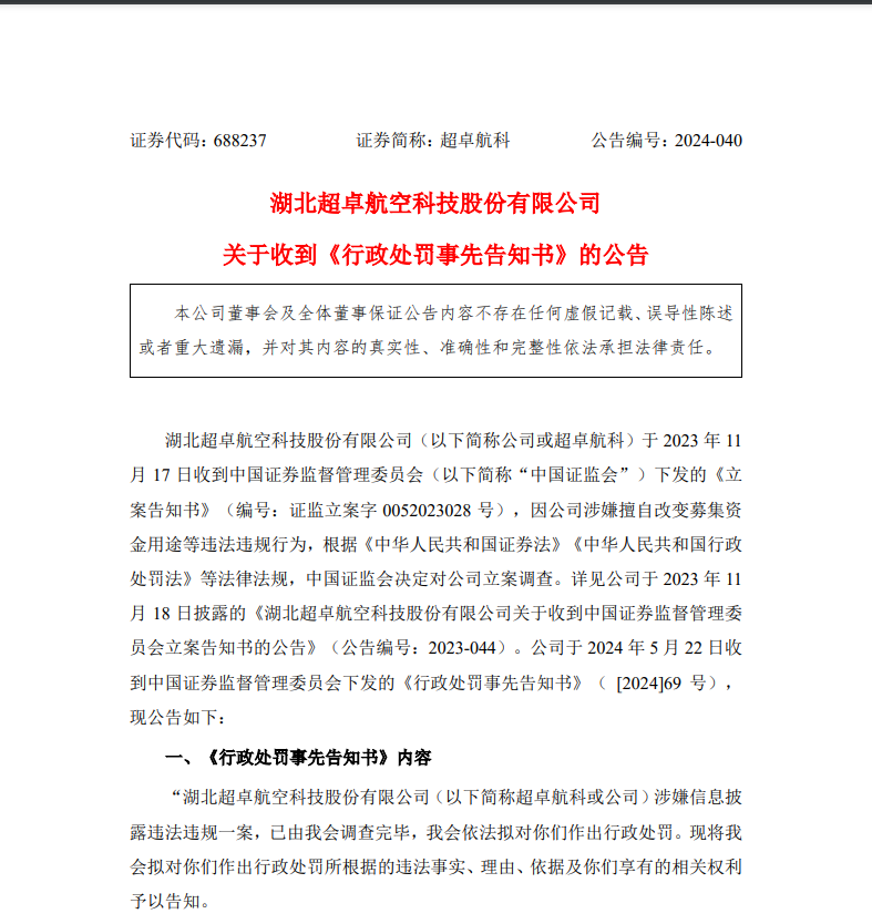2024年5月22日,公司收到了证监会下发的《行政处罚事先告知书》。告知书显示,经查,超卓航科及相关人员涉嫌违法违规的事实主要有二。