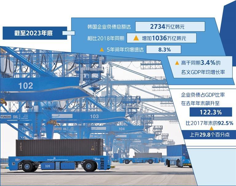 韩国央行日前发布的《韩国企业负债现状及启示》报告书显示,截至2023年底,韩国企业负债总额达到2734万亿韩元,相比2018年同期增加了1036万亿韩元,5年间年均增速达8.3%,明显高于同期3.4%的名义GDP年均增长率。企业负债占GDP的比率在去年年末飙升至122.3%,比2017年末的92.5%上升了29.8个百分点。