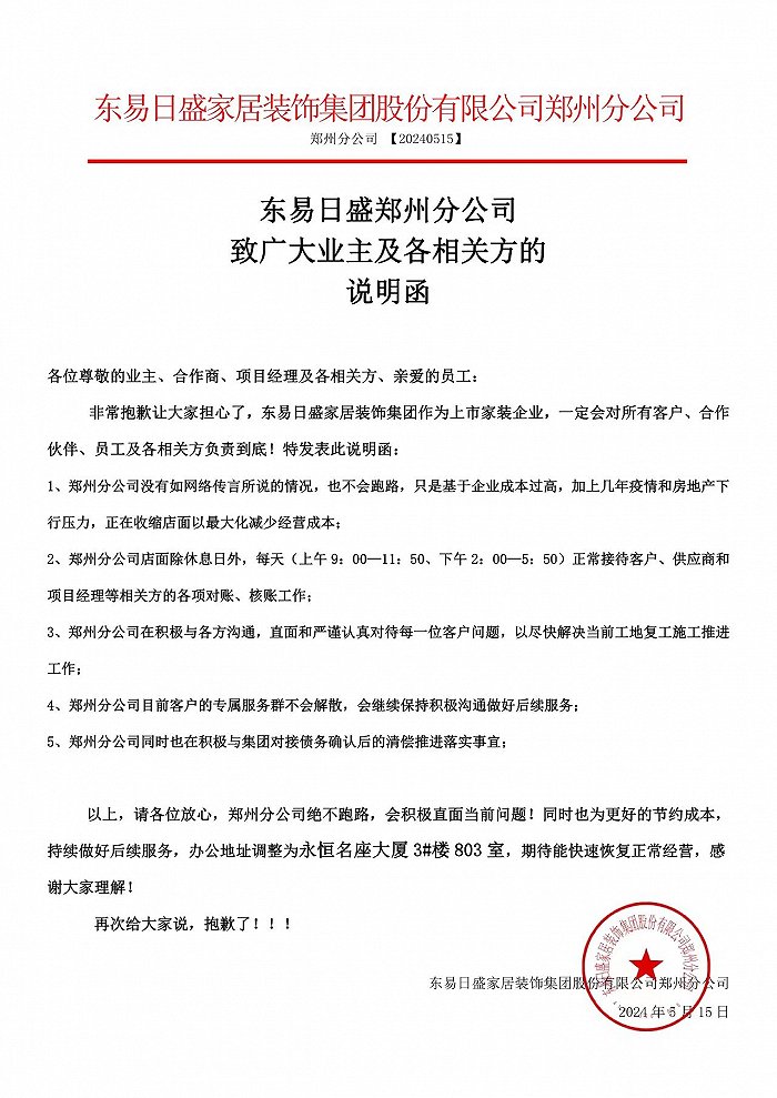 在同一天,东易日盛郑州分公司则发布了《致广大业主及各相关方说明函》,否认了跑路传闻,表示会对所有客户、员工及相关方负责到底。该说明函解释称,基于几年疫情和房地产下行压力,正在收缩店面以最大化减少经营成本。