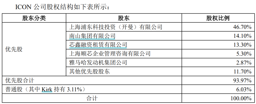 ICON公司的股权结构中,浦东科投(开曼)持股46.7%,是其第一大股东。浦东科投(开曼)是浦东科投的全资子公司,而持有上工申贝5%以上股份、且是其第一大股东的浦科飞人,也由浦东科投控股。