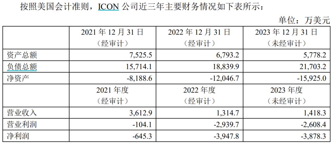 按照美国会计准则,ICON公司近三年持续亏损,且净资产均为负值。