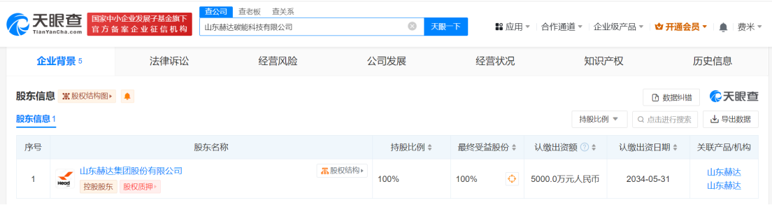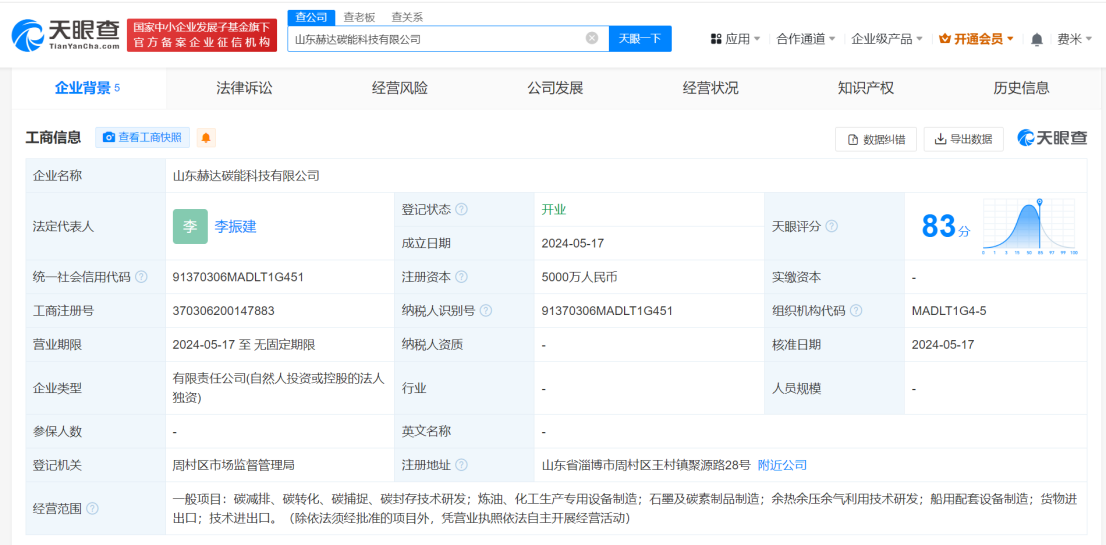 天眼查App显示,近日,山东赫达碳能科技有限公司成立,法定代表人为李振建,注册资本5000万人民币,经营范围含碳减排、碳转化、碳捕捉、碳封存技术研发,炼油、化工生产专用设备制造,石墨及碳素制品制造,余热余压余气利用技术研发等。股东信息显示,该公司由山东赫达(002810)全资持股。