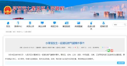 据贵州省毕节市七星关区人民政府网站5月20日消息,5月18日22时50分许,七星关区水箐镇发生一起疑似燃气罐爆炸事件。事发后,应急、公安、消防、市场监管、住建、工信等相关部门迅速前往处置救援。事件导致2人死亡,4人受伤,伤者已送医救治,暂无生命危险。目前,相关部门正在进行后续处置,事发原因正在调查中。