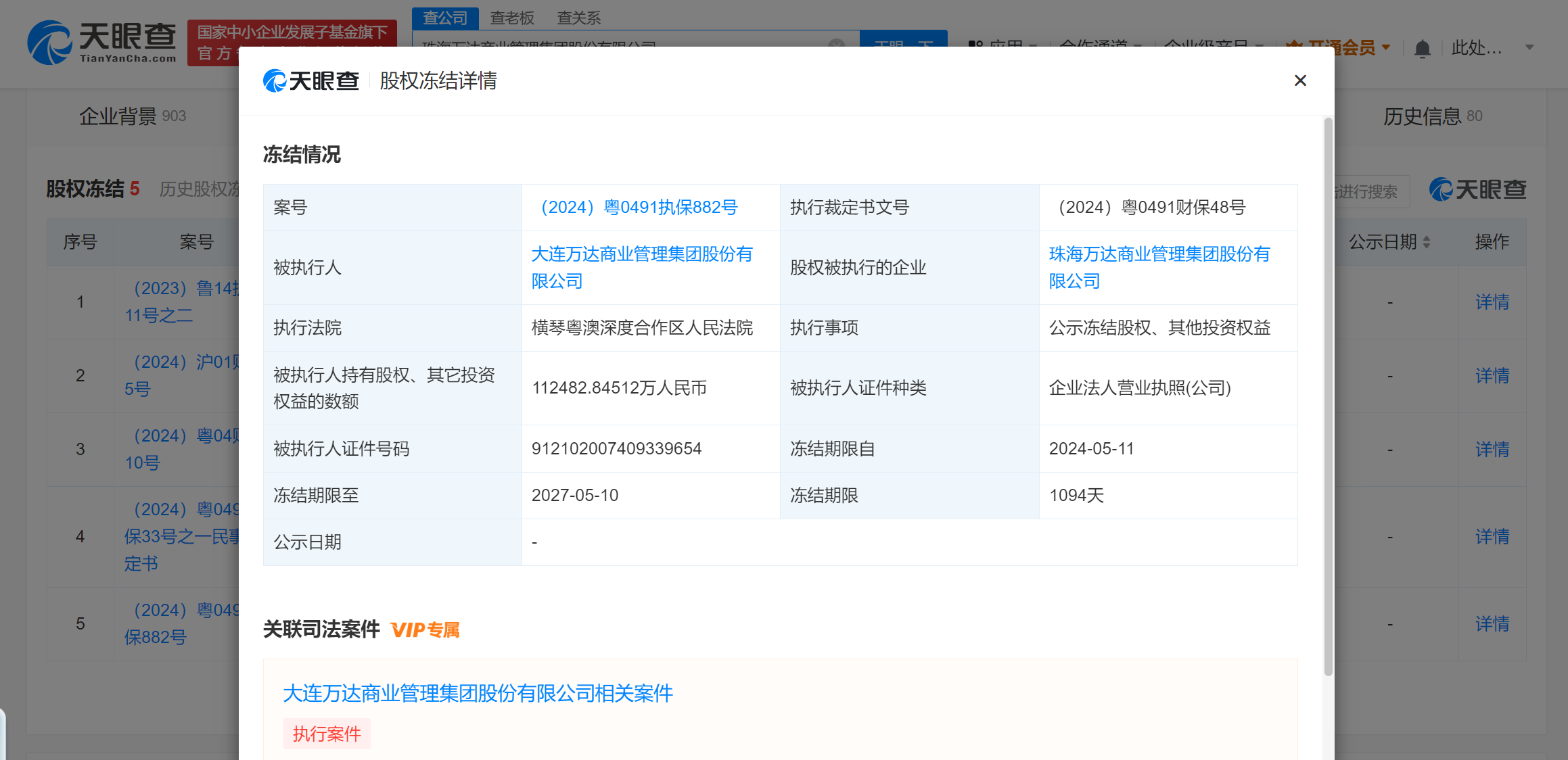 天眼查App显示,近日,珠海万达商业管理集团股份有限公司新增一则股权冻结信息,被执行人为大连万达商业管理集团股份有限公司,冻结股权数额11.24亿余元,冻结期限自2024年5月11日至2027年5月10日,执行法院为横琴粤澳深度合作区人民法院。天眼风险信息显示,大连万达商业理公司持有珠海万达商管公司约50.72亿股权,此前已多次被冻结。
