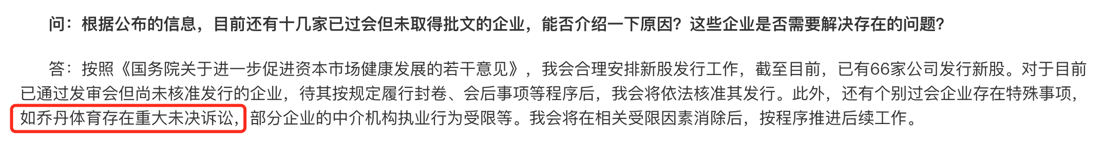 在2014年11月28日新闻发布会上,证监会就明确乔丹体育受到了诉讼的拖累。