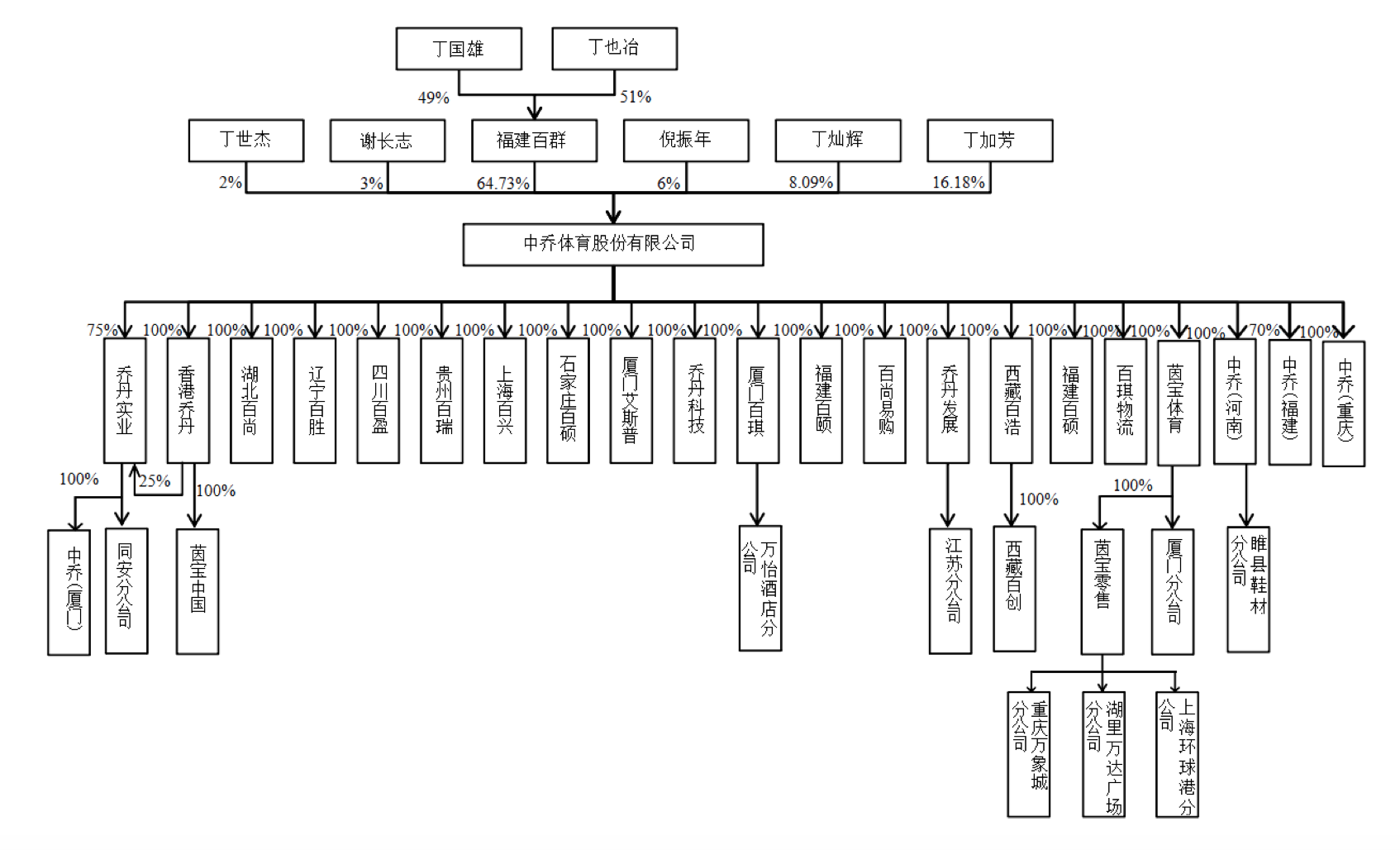 来源:公告从披露来看,福建百群持有中乔体育29128.5万股股份,占公司总股本的64.73%,为公司的控股股东。福建百群成立于2009年6月18日,从事投资管理,与发行人主营业务不存在竞争关系,由丁也治持有51%股权,丁国雄持有49%股权。丁国雄、丁也治为夫妇,故中乔体育的实际控制人为丁国雄、丁也治。