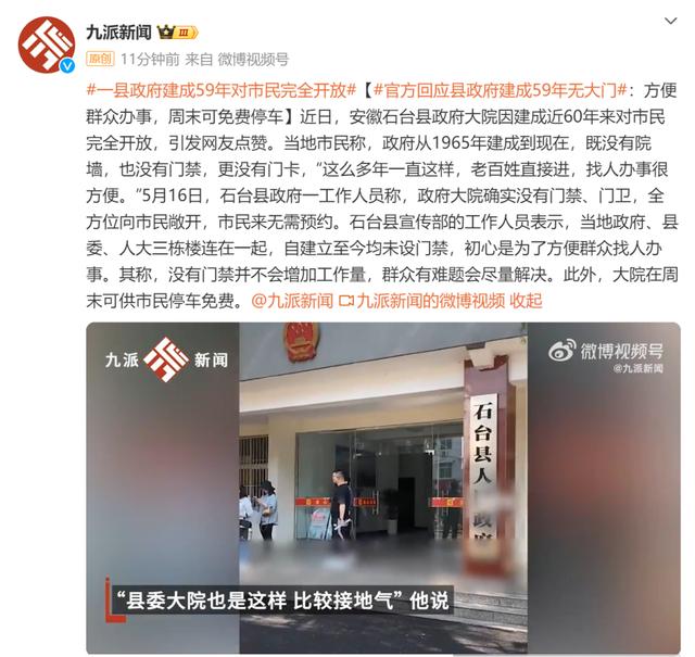 近日,安徽石台县政府大院因建成近60年来对市民完全开放,引发网友点赞。当地市民称,政府从1965年建成到现在,既没有院墙,也没有门禁,更没有门卡,“这么多年一直这样,老百姓直接进,找人办事很方便。”5月16日,石台县政府一工作人员称,政府大院确实没有门禁、门卫,全方位向市民敞开,市民来无需预约。石台县宣传部的工作人员表示,当地政府、县委、人大三栋楼连在一起,自建立至今均未设门禁,初心是为了方便群众找人办事。其称,没有门禁并不会增加工作量,群众有难题会尽量解决。此外,大院在周末可供市民停车免费。(@九派新闻)