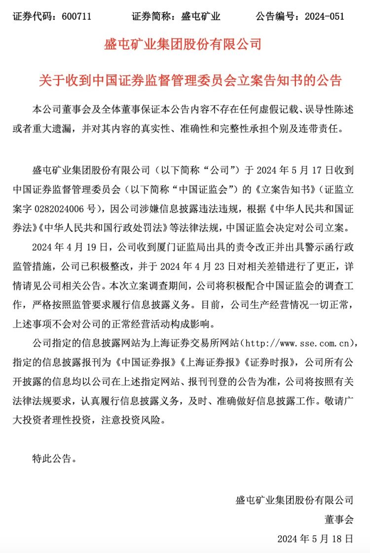 盛屯矿业(600711)5月17日晚间公告,公司17日收到中国证监会的《立案告知书》,因公司涉嫌信息披露违法违规,中国证监会决定对公司立案。