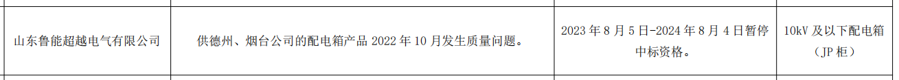 公告显示,山东鲁能超越电气有限公司,在供德州、烟台公司的配电箱产品 2022 年 10 月发生质量问题。