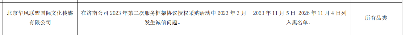公告显示,北京华风联盟国际文化传媒有限公司,在济南公司 2023 年第二次服务框架协议授权采购活动中 2023 年 3 月发生诚信问题。