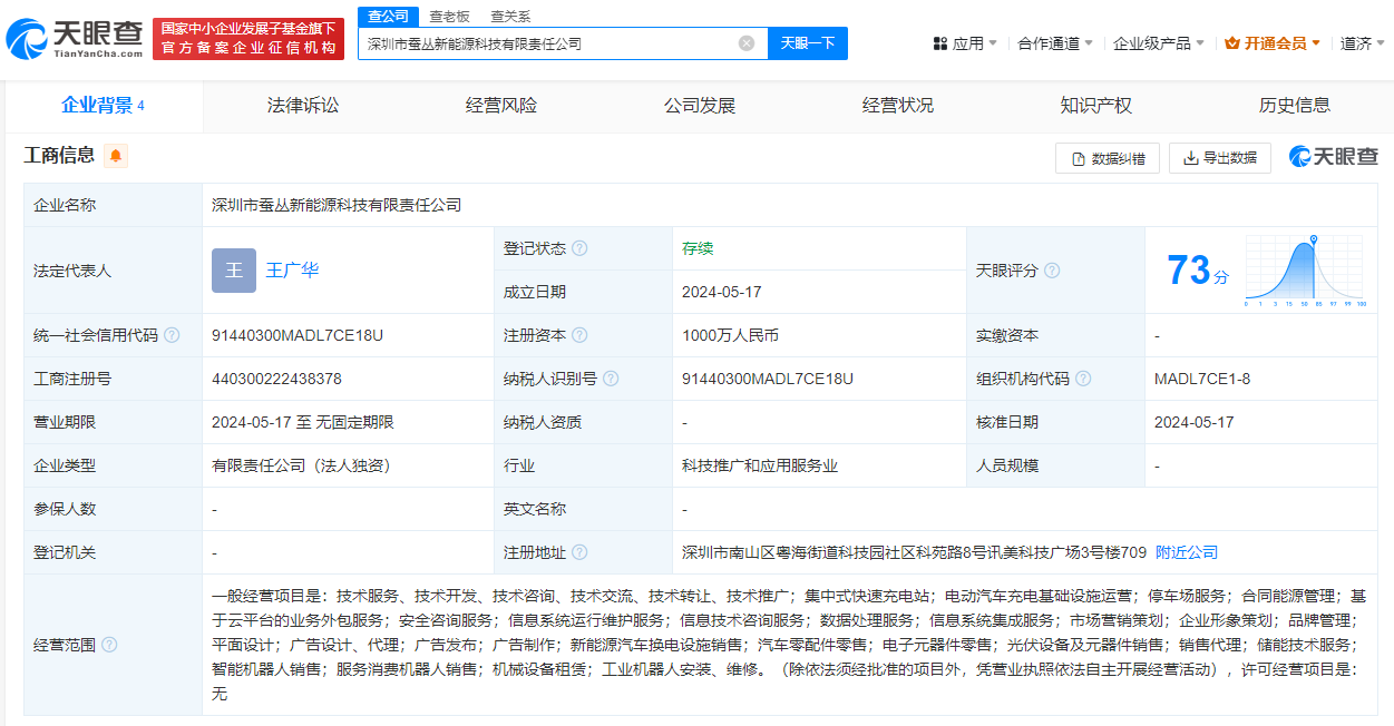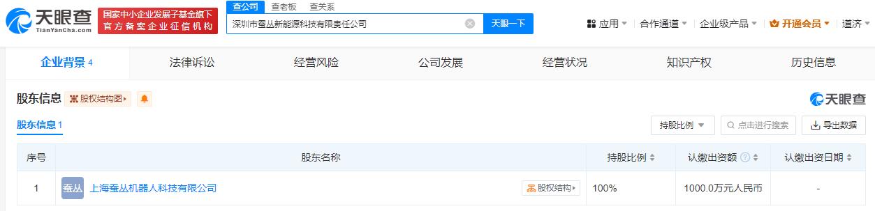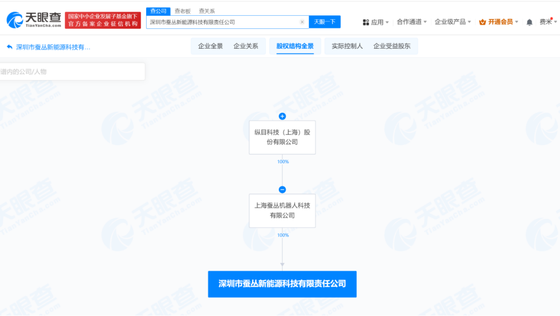 天眼查App显示,近日,深圳市蚕丛新能源科技有限责任公司成立,法定代表人为王广华,注册资本1000万人民币,经营范围含新能源汽车换电设施销售、汽车零配件零售、电子元器件零售、光伏设备及元器件销售、储能技术服务、智能机器人销售、服务消费机器人销售等。股权全景穿透图显示,该公司由纵目科技(上海)股份有限公司旗下上海蚕丛机器人科技有限公司全资持股。
