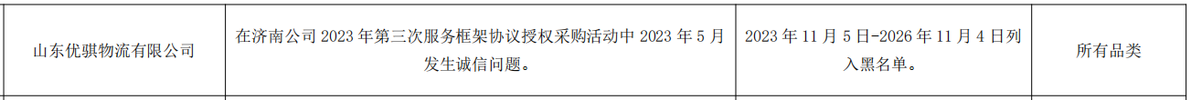 公告显示,山东优骐物流有限公司,在济南公司 2023 年第三次服务框架协议授权采购活动中2023 年 5 月发生诚信问题。