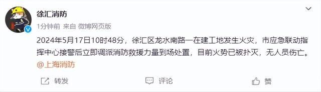 据徐汇消防通报:2024年5月17日10时48分,徐汇区龙水南路一在建工地发生火灾,市应急联动指挥中心接警后立即调派消防救援力量到场处置,目前火势已被扑灭,无人员伤亡。