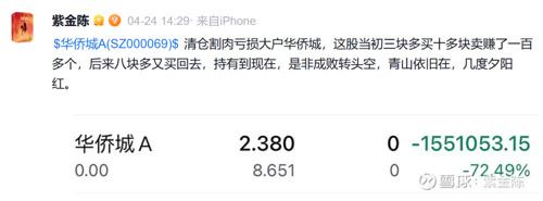 翻看紫金陈的账号,基金君发现,他在4月24日清仓了华侨城,巨亏近200万。他在社交平台上表示,这股三块多买十多块卖,赚了100多万,后来又在八块多买回去,持有到现出卖出,是非成败转头空。