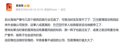 就在前一天,知名作家紫金陈在某社交平台上表示,自己地产股爆亏几百个(万元)割肉后就行业见底了。他还表示,“如果当时拿的是其他没有暴雷风险的标的,那一阵子也挺过去了。或者之前没有重仓地产套牢,前阵子也会逆向抄底。”