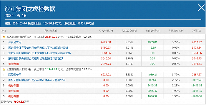 需要注意的是,5月16日,在作手新一和小鳄鱼积极做多的同时,另一个知名游资常用席位国投证券西安曲江池南路却出现在滨江集团卖方前五位中,卖出金额为3029.4万元。