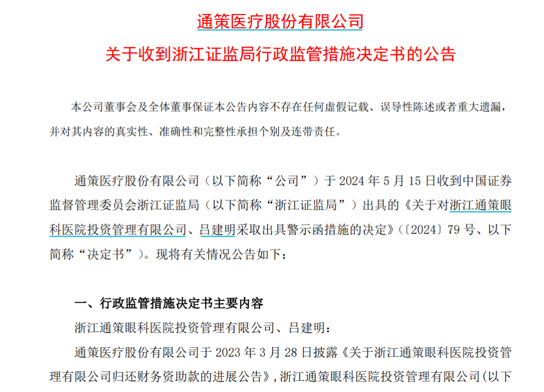 5月16日,通策医疗发布公告称,公司收到浙江证监局出具的《关于对浙江通策眼科医院投资管理有限公司、吕建明采取出具警示函措施的决定》。同时,上交所对通策医疗及时任董事长等有关责任人予以监管警示。