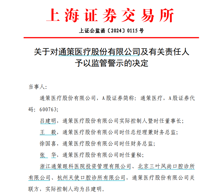 鉴于上述违规事实和情节,根据有关规定,决定对通策医疗、公司实际控制人暨时任董事长吕建明、公司时任总经理兼时任财务总监王毅、公司时任财务总监徐国喜、公司时任董秘张华、关联方浙江通策眼科医院投资管理有限公司、北京三叶风尚口腔诊所有限公司和杭州天使口腔诊所有限公司予以监管警示。