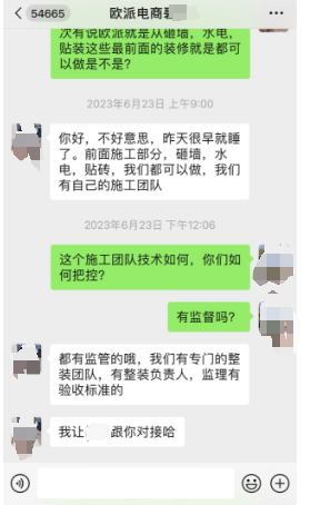 魏翔(化名)的经历与陆华相似,他是在微信平台看到欧派整装家居的广告,称毛坯也可以装修。在与相关客服沟通过意向后,他的信息同样被推给莆田经销商黄某处,由线上转为线下。