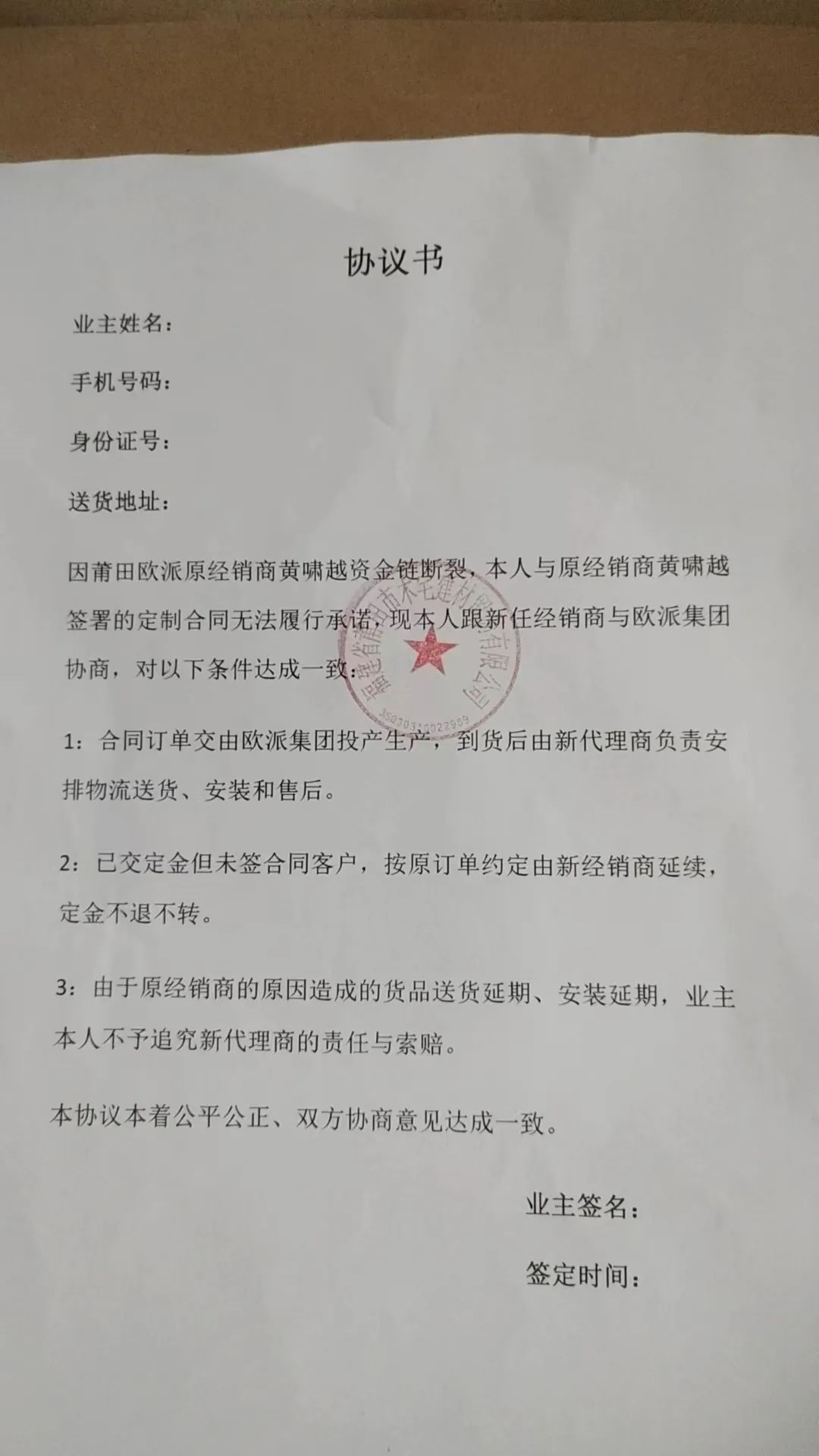 大约从5月10日开始,不少定制类客户陆续接到新经销商继续履约的通知,但双方需要签订一个协议,具体内容包括,合同订单由欧派集团继续投产生产,新经销商负责物流送货、安装、售后;已交定金但未签合同的客户,按原订单履约,定金不退不转;因原经销商导致的货品配送延期、安装延期,不得追究新经销商的责任与索赔。