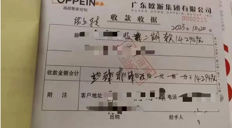 对于这样的处理方式,拎包入住及整装家居客户显然无法接受。他们说自己确实是在欧派经销商这里下的单,定金收据上也明明白白写着广东欧派集团,打款环节的纰漏根本不在客户识别范围内。