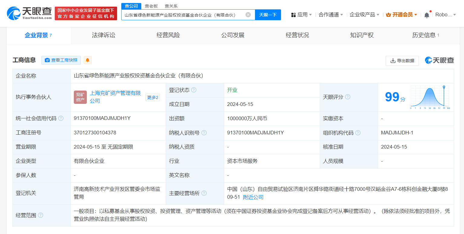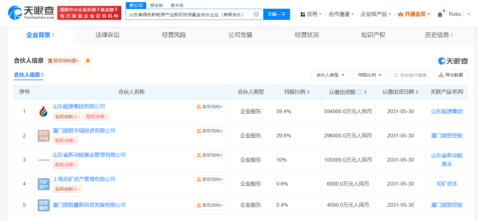 天眼查App显示,近日,山东省绿色新能源产业股权投资基金合伙企业(有限合伙)成立,执行事务合伙人为上海兖矿资产管理有限公司、山东能源集团有限公司,出资额100亿人民币,经营范围为以私募基金从事股权投资、投资管理、资产管理等活动。合伙人信息显示,该企业由山东能源集团有限公司、厦门国贸华瑞投资有限公司、山东省新动能基金管理有限公司、上海兖矿资产管理有限公司、厦门国贸鑫新投资发展有限公司共同出资。