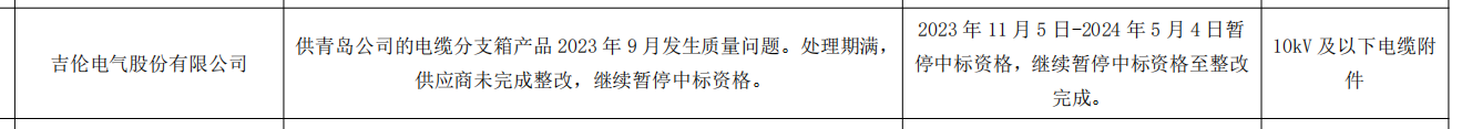 公告显示,吉伦电气股份有限公司,在供青岛公司的电缆分支箱产品 2023 年 9 月发生质量问题。处理期满,供应商未完成整改,继续暂停中标资格。