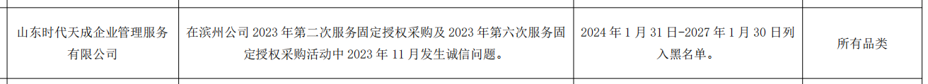 公告显示,山东时代天成企业管理服务有限公司,在滨州公司2023年第二次服务固定授权采购及2023年第六次服务固定授权采购活动中 2023 年 11 月发生诚信问题。