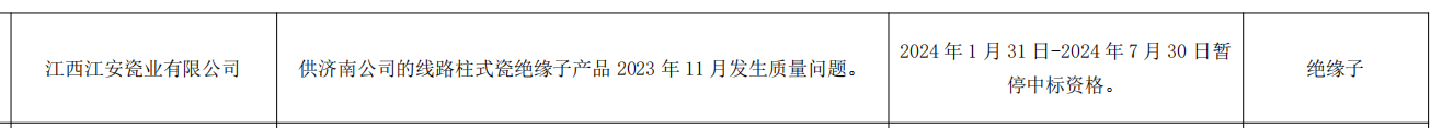 公告显示,江西江安瓷业有限公司,在供济南公司的线路柱式瓷绝缘子产品 2023 年 11 月发生质量问题。