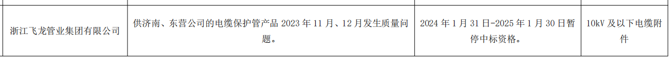 公告显示,浙江飞龙管业集团有限公司,在供济南、东营公司的电缆保护管产品 2023 年 11 月、12 月发生质量问 题。