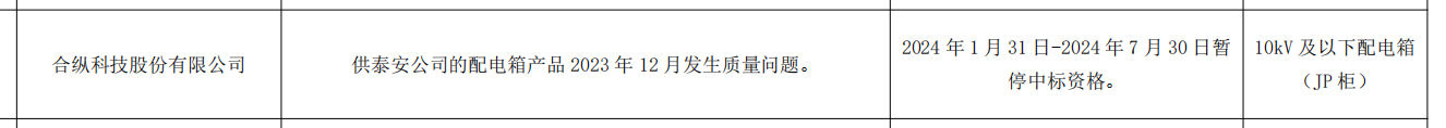 公告显示,合纵科技股份有限公司,在供泰安公司的配电箱产品 2023 年 12 月发生质量问题。