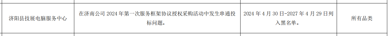 公告显示,济阳县技展电脑服务中心,在济南公司 2024 年第一次服务框架协议授权采购活动中发生串通投标问题。
