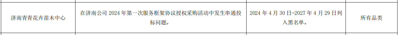 公告显示,济南青青花卉苗木中心,在济南公司 2024 年第一次服务框架协议授权采购活动中发生串通投标问题。